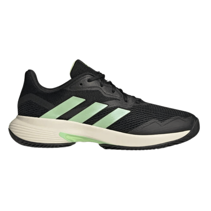 Prisvärd sko från Adidas med en sula anpassad för hala underlag, tack vare den typen av räffling som används på undersidan får du absolut bästa grepp på banor med mer sand. Skön mesh på ovansidan säkerställer komforten medans TPU i mellanfoten ger den stabilitet som krävs på tennisbanan och padelbanan. Skon är mycket lätt och smidig så du får en skön känsla när dus springer på banan. Vidare skall sägas att Adidas har förstärkt skon på mer utsatta ställen där skon ofta lättare slit när man spelar. Klassisk ren design i svart och vitt ger dig den look som krävs på banan. Färg: Svart med gröna detaljer