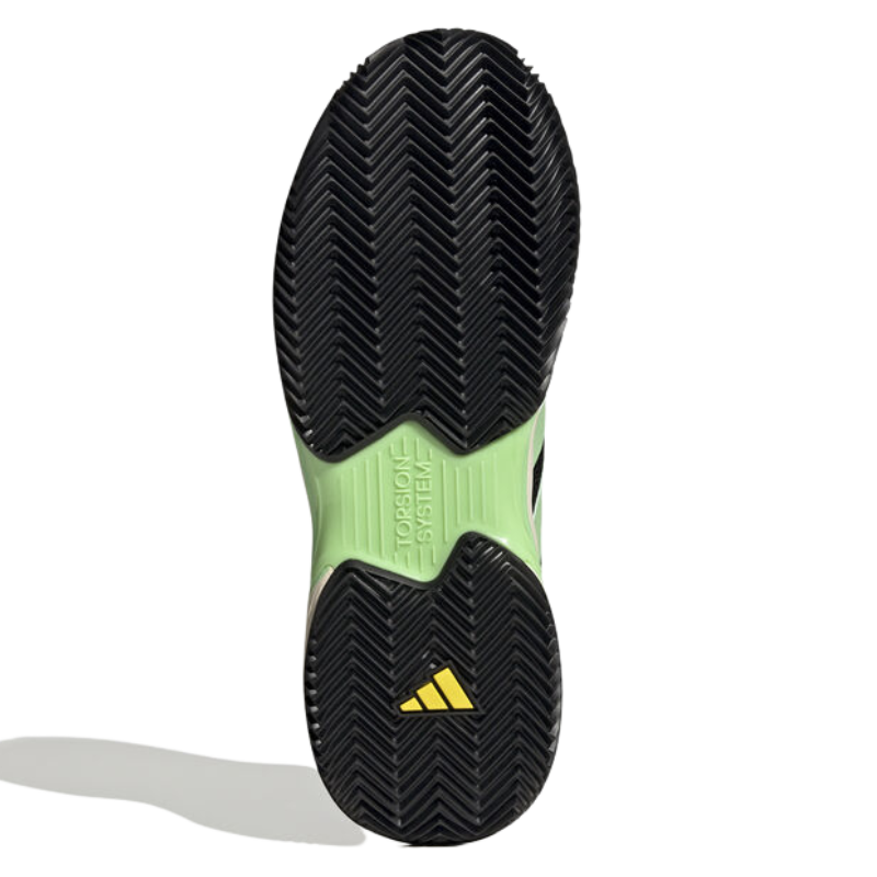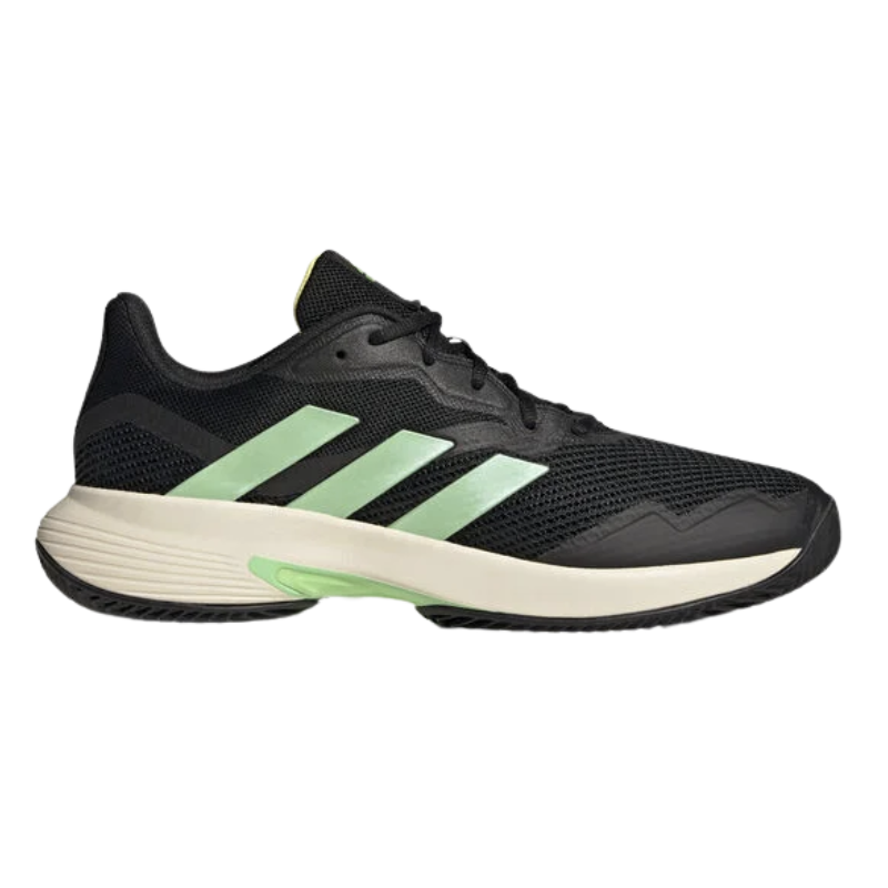 Prisvärd sko från Adidas med en sula anpassad för hala underlag, tack vare den typen av räffling som används på undersidan får du absolut bästa grepp på banor med mer sand. Skön mesh på ovansidan säkerställer komforten medans TPU i mellanfoten ger den stabilitet som krävs på tennisbanan och padelbanan. Skon är mycket lätt och smidig så du får en skön känsla när dus springer på banan. Vidare skall sägas att Adidas har förstärkt skon på mer utsatta ställen där skon ofta lättare slit när man spelar. Klassisk ren design i svart och vitt ger dig den look som krävs på banan. Färg: Svart med gröna detaljer