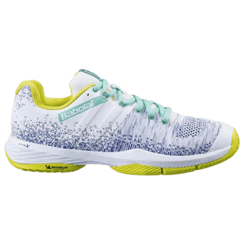 Babolat har tagit fram en padelsko specifikt för damer med en lättare och smidigare design. I samarbete med Mondo (officiell gräsleverantör till World Padel Tour) och världsledande gummitillverkaren Michelin har Babolat tagit fram en riktigt bra padelsko med 0.5mm djupare mönster i undersulan. Vilket resulterar i optimalt grepp på padelbanan oavsett underlag. Gummit är dessutom mer följsamt vilket förhindrar att du fastnar i mattan och riskerar skador på knän och leder. Skons sula har en kombination av små dubbar som håller greppet för banor med mindre sand och det klassiska fiskbensmönstrade undersulan som ger bäst grepp på hala banor med lite mer sand på ytan.