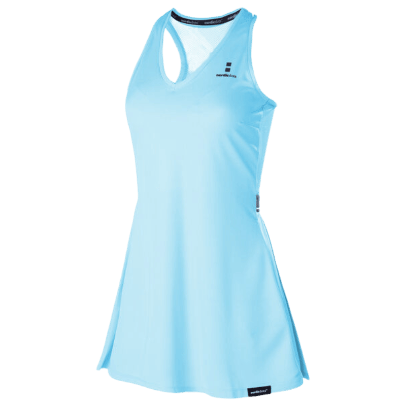 Köp en himmelskt blå tennisklänning eller padelklänning ifrån Nordicdots. Är det dags att förnya garderoben av tenniskläder och padelkläder? Här kan du köpa en riktigt snygg klänning med massor av fina detaljer och dessutom tillverkad med 100% återvunnen Polyester. V-ringad och med en luftig rygg ger dig maximalt med luftgenomströmning för att behålla en torr känsla på banan. Klänningen har en veckad nederdel som ger en extra krydda designmässigt. Sist men inte minst gör ett klimatsmart val när du handlar tenniskläder och padelkläder. Färg: Himmelsblå Material: 100% Återvunnen Polyester Tvättråd: Maskintvätt, 40 grader syntet Serving you with passion since 1976!