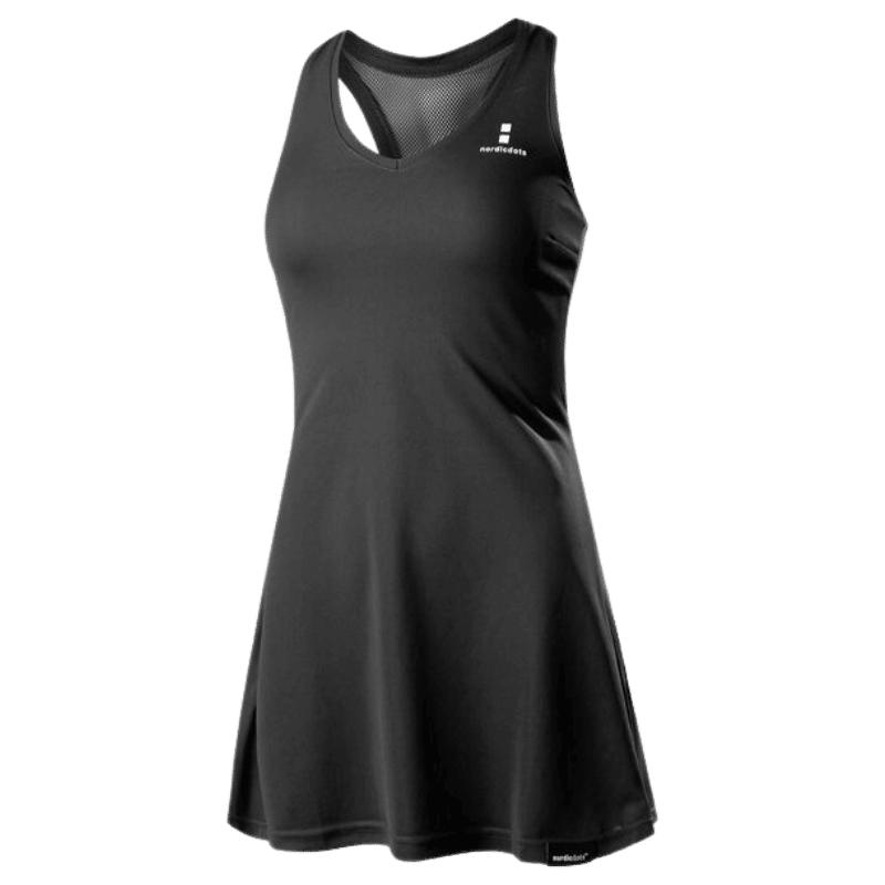 Köp en svart tennisklänning eller padelklänning ifrån Nordicdots. Är det dags att förnya garderoben av tenniskläder och padelkläder? Här kan du köpa en riktigt snygg klänning med massor av fina detaljer och dessutom tillverkad med 100% återvunnen Polyester. V-ringad och med en luftig rygg ger dig maximalt med luftgenomströmning för att behålla en torr känsla på banan. Klänningen har en veckad nederdel som ger en extra krydda designmässigt. Sist men inte minst gör ett klimatsmart val när du handlar tenniskläder och padelkläder. Färg: Svart Material: 100% Återvunnen Polyester Tvättråd: Maskintvätt, 40 grader syntet Serving you with passion since 1976!