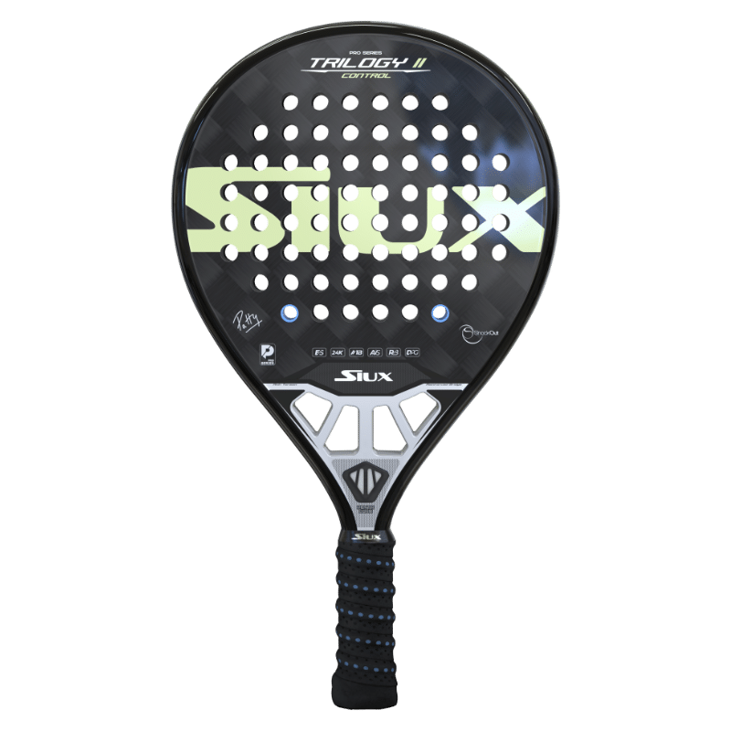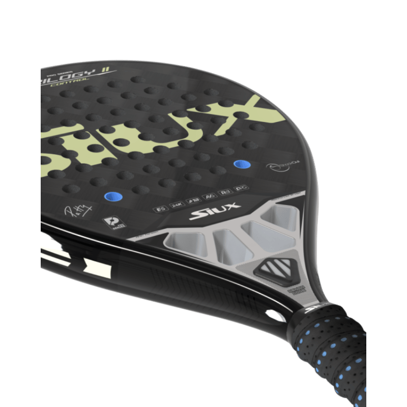 Siux Trilogy II Control 24k är ett runt padelracket med medelbalans från Siux som har sin stryka i defensiven. Den runda formen ger en centrerad sweet spot och med den styva träffytan i 24k kolfiber ger racket fin precision och respons. Kärnan består av EVA Medio som är ett medelhårt skum.